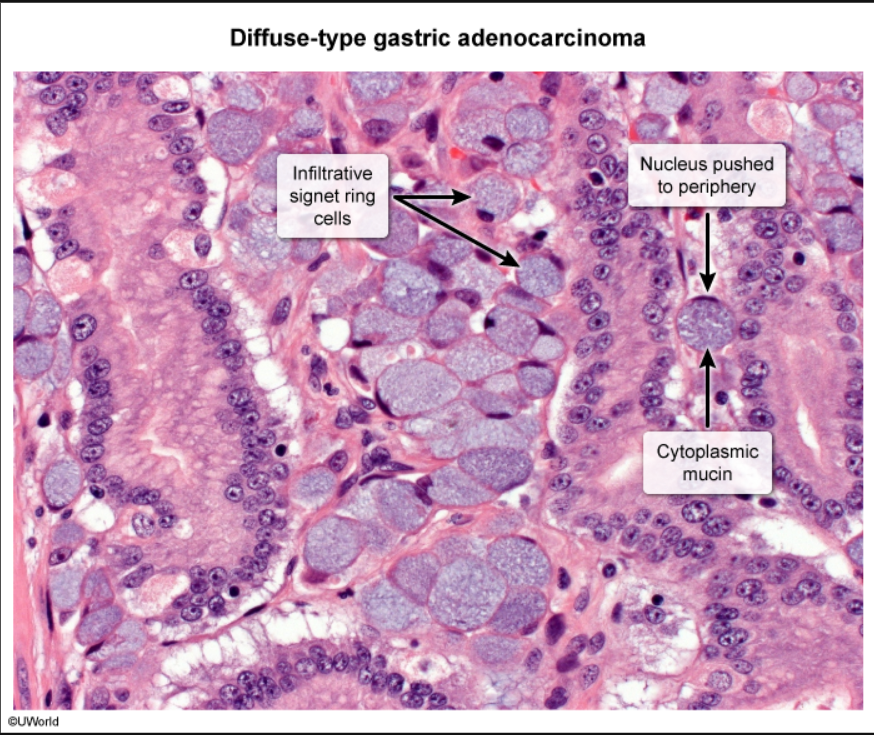 (Choice D) Signet ring cell carcinoma can occur in different locations, such as the stomach, breast, ovary, and colorectal area. Tumor cells contain abundant mucins that push the nuclei to the periphery and give the tumor cells their characteristic appearance.