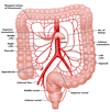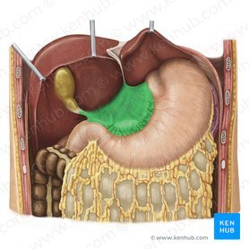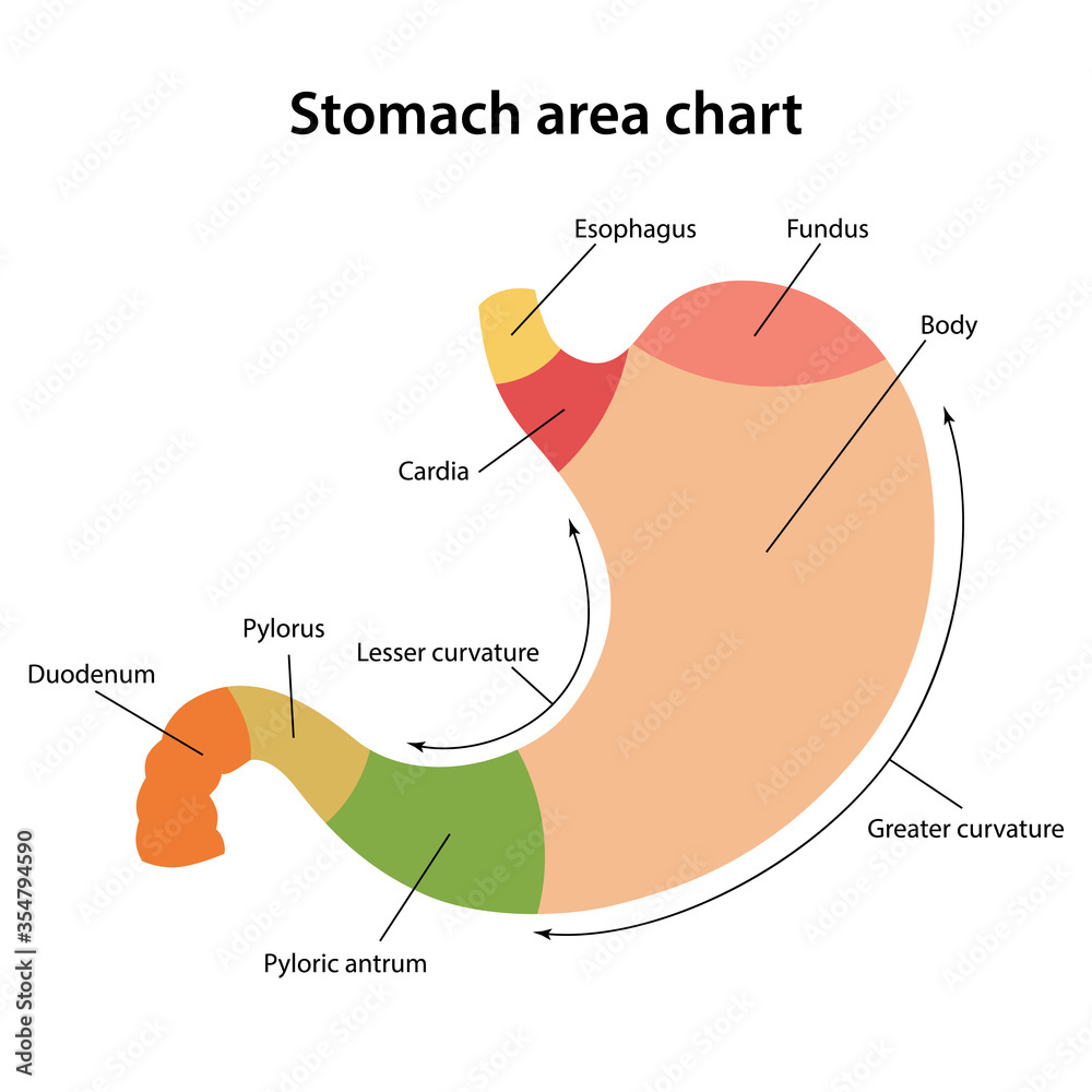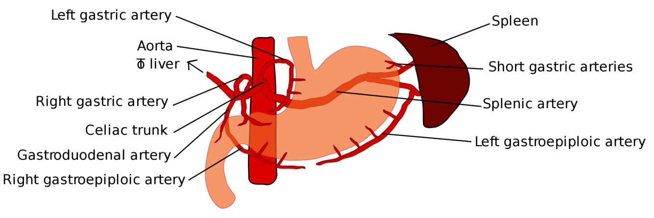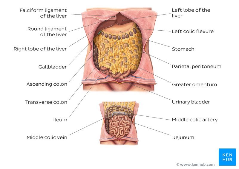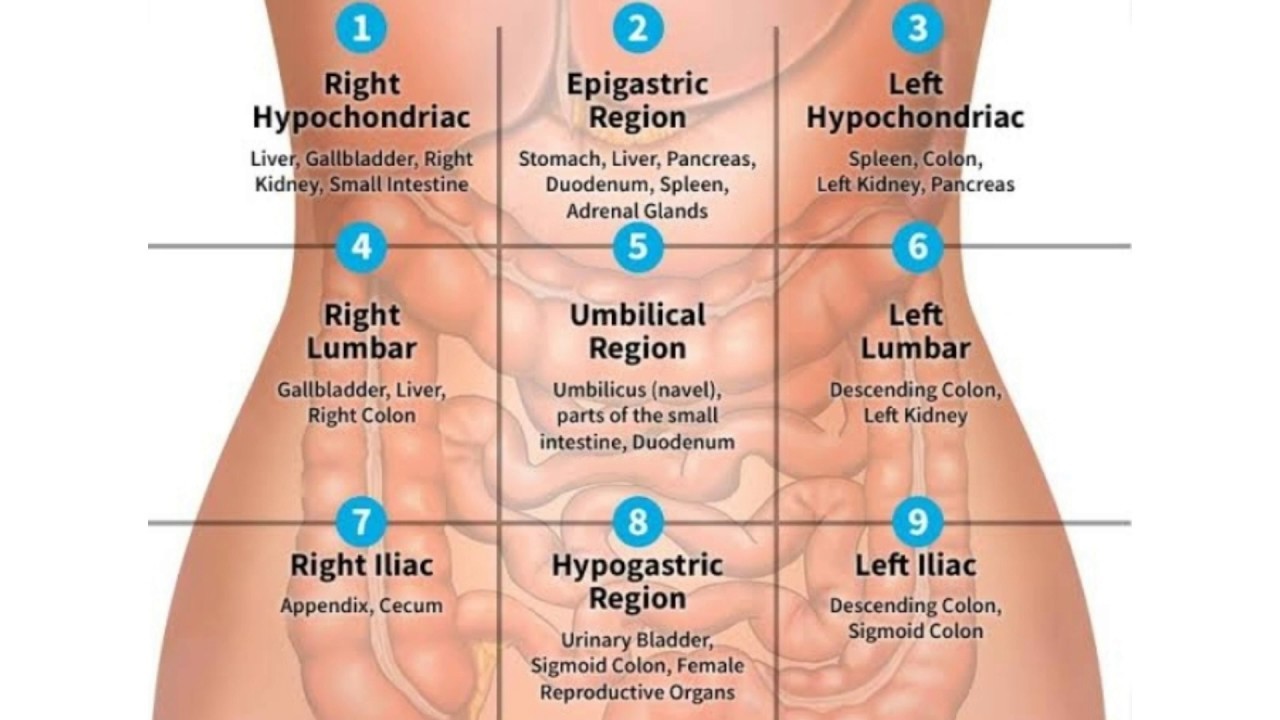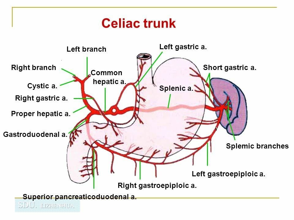 stomach Spleen liver Jejunum and ilium Transverse colon Sigmoid colon