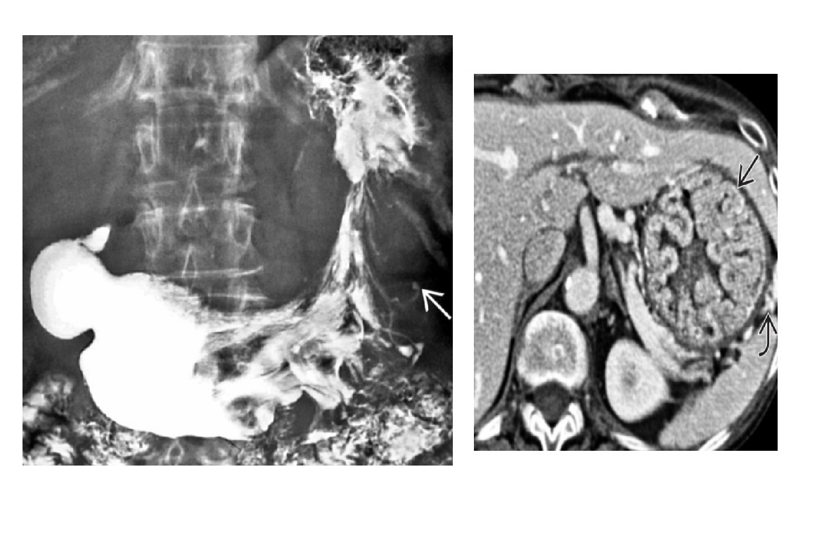 Large saccular outpouching just above the diaphragm, right side?