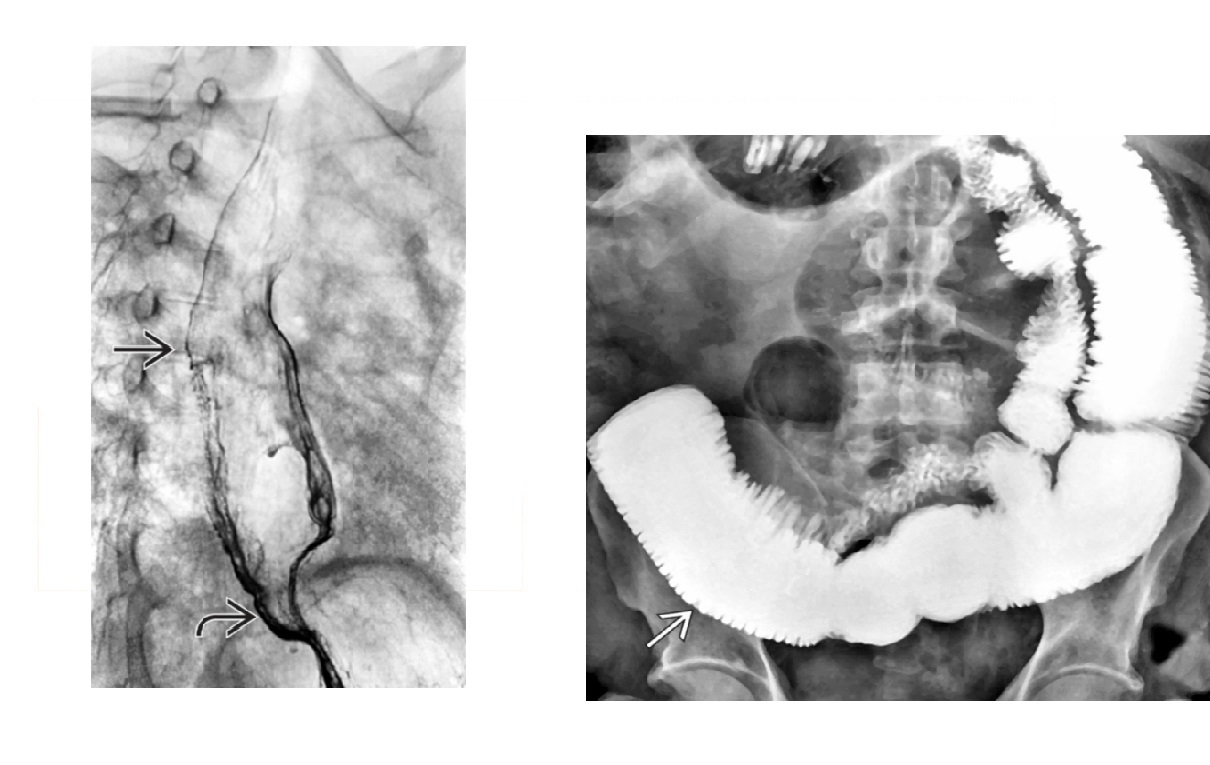 classic “reverse S” indentation of the contrast column on frontal view produced by an upper indentation of the right-sided aortic arch and the lower indentation is by the left-sided aortic arch