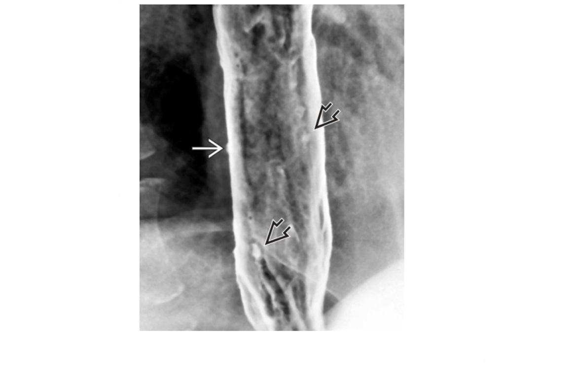 Barium - multiple, tiny (1- to 4-mm depth), flask-like outpouchings in the oesophagus
