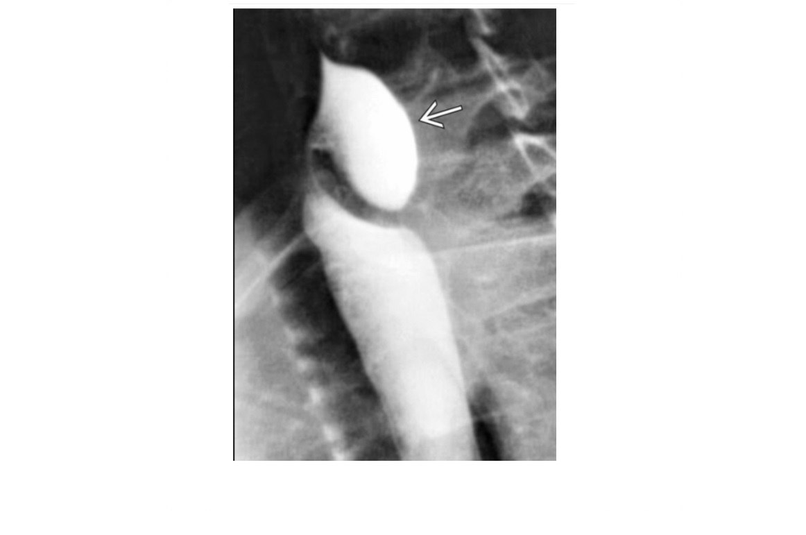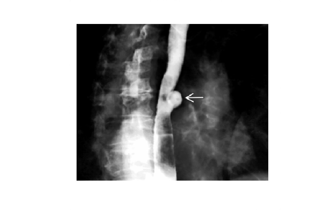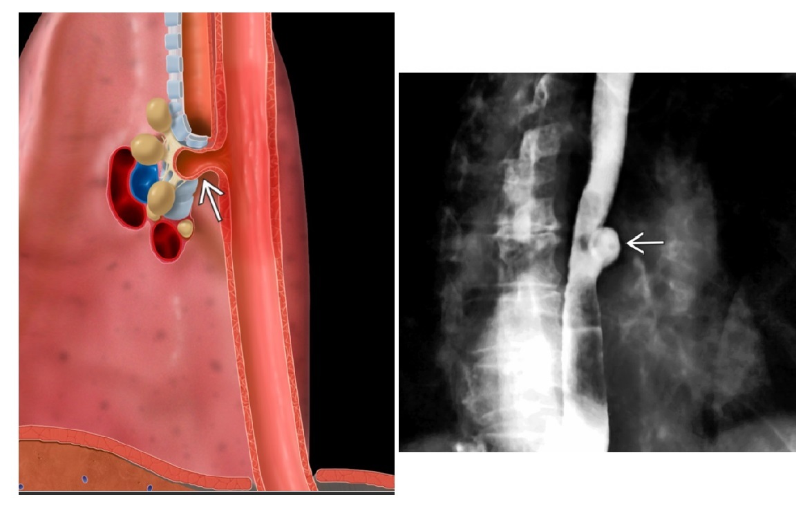 Barium-filled tented or triangular outpouching in the mid oesophagus