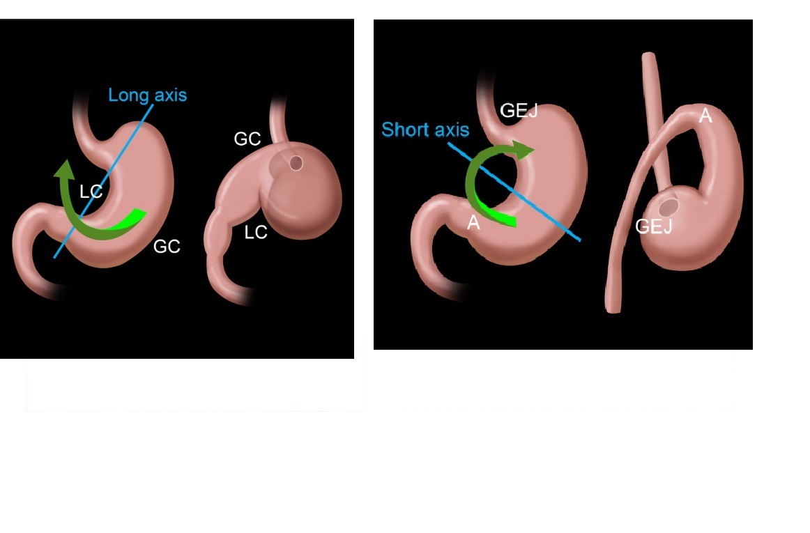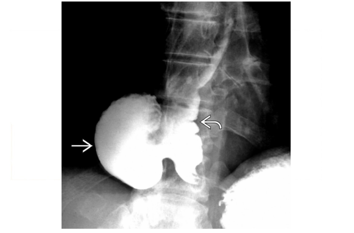Can be mistaken for paraesophageal hernia - usually in on the left