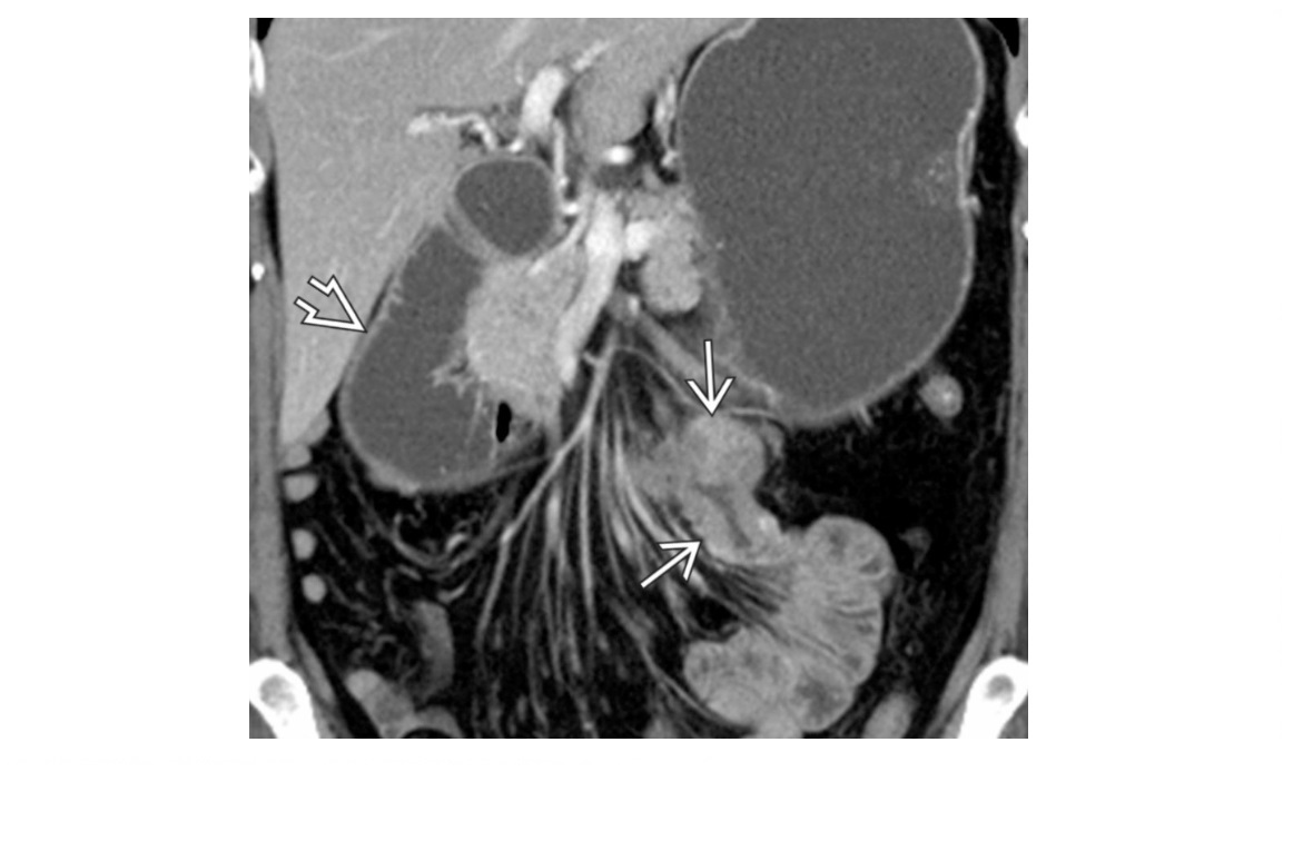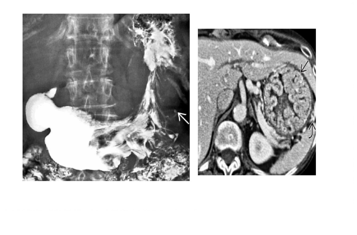 Focal circumferential bowel wall thickening in the proximal small bowel