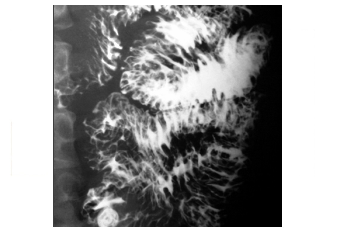Grossly thickened, lobulated folds in gastric fundus and body with poor barium coating. low albumin
