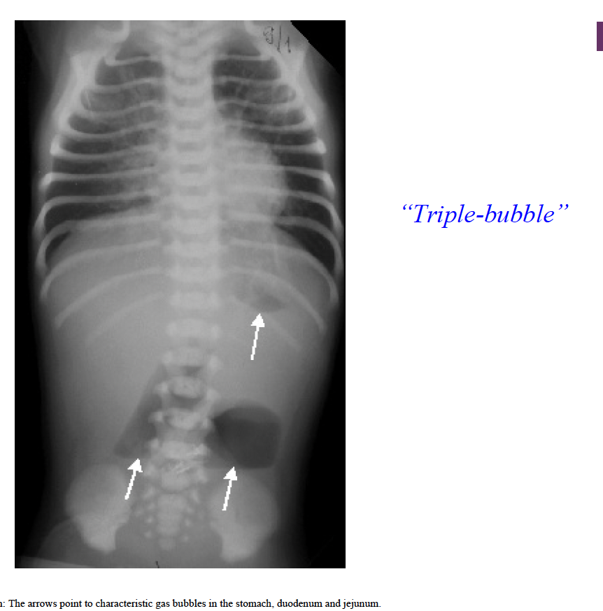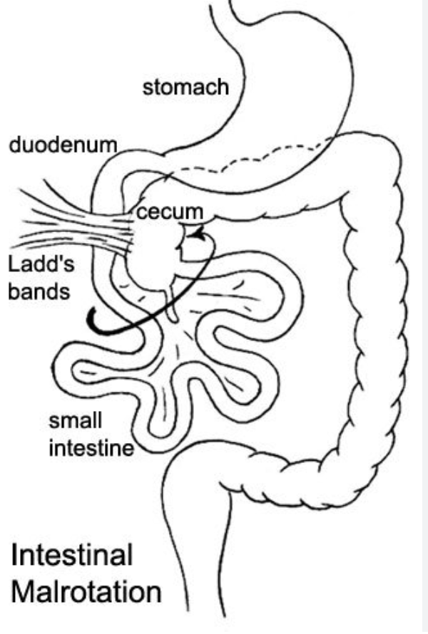 causes displacement of cecum to right upper abdominal quarter and obstruction of duodenum by Ladd’s band