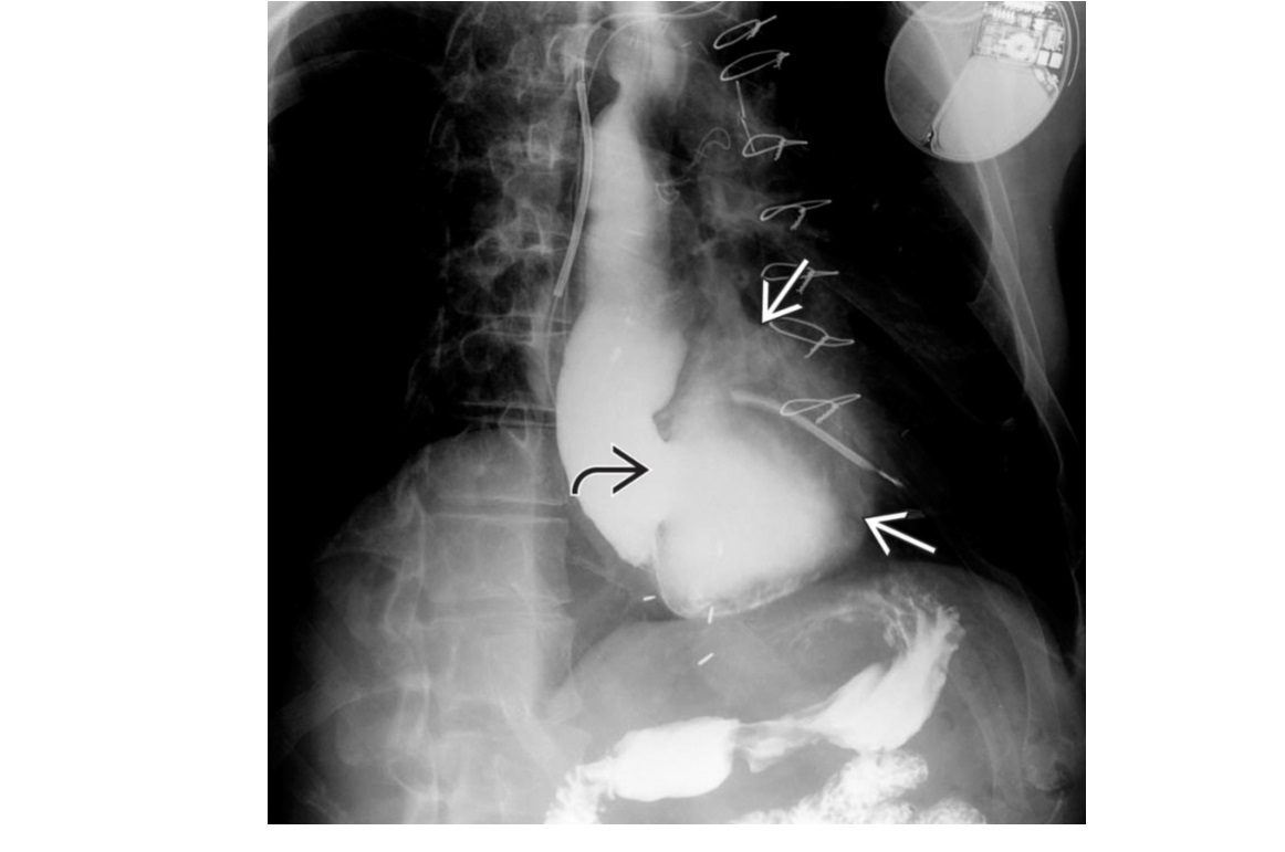 Can be mistaken for paraesophageal hernia - usually in on the left