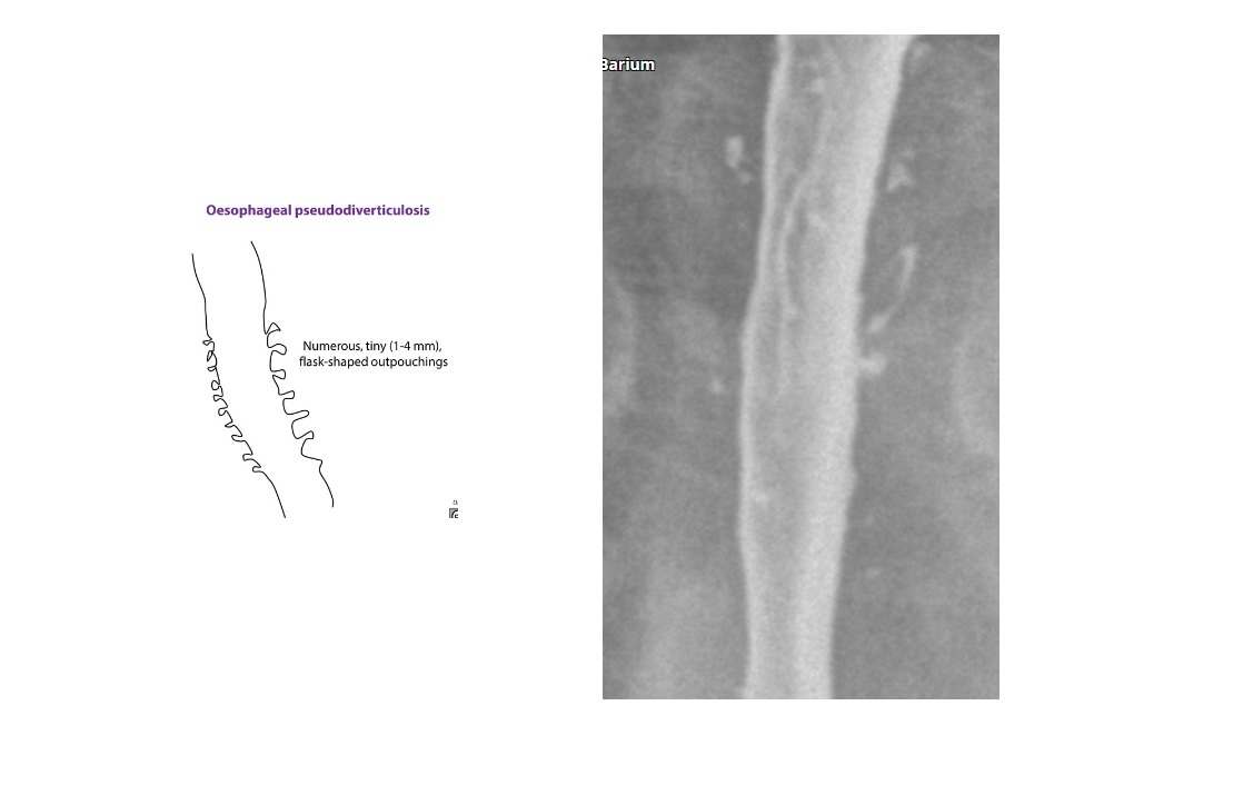 Barium - multiple, tiny (1- to 4-mm depth), flask-like outpouchings in the oesophagus