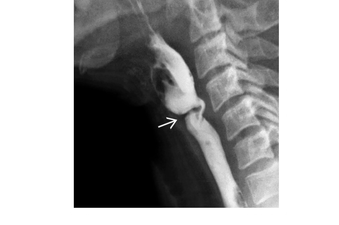 - affects skeletal muscle so therefore affects the upper third of oesophagus, retention of barium in the valeeculae, regurg nasal reflux, failure of contrast to progress in upper third without gravity