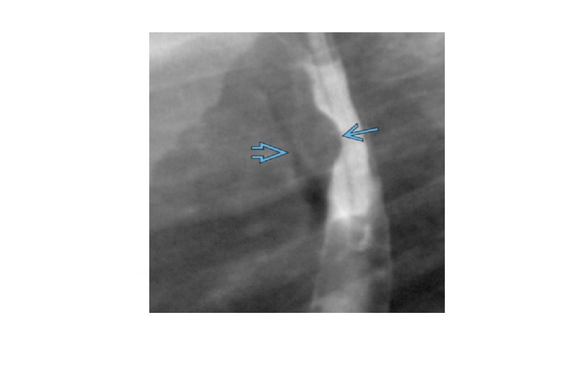 Barium-filled tented or triangular outpouching in the mid oesophagus