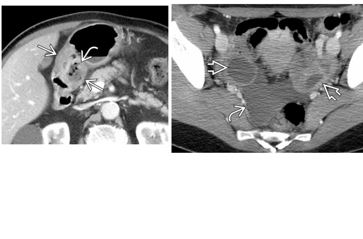 can infiltrate into bowel wall/adjacent structures, can cause SBO