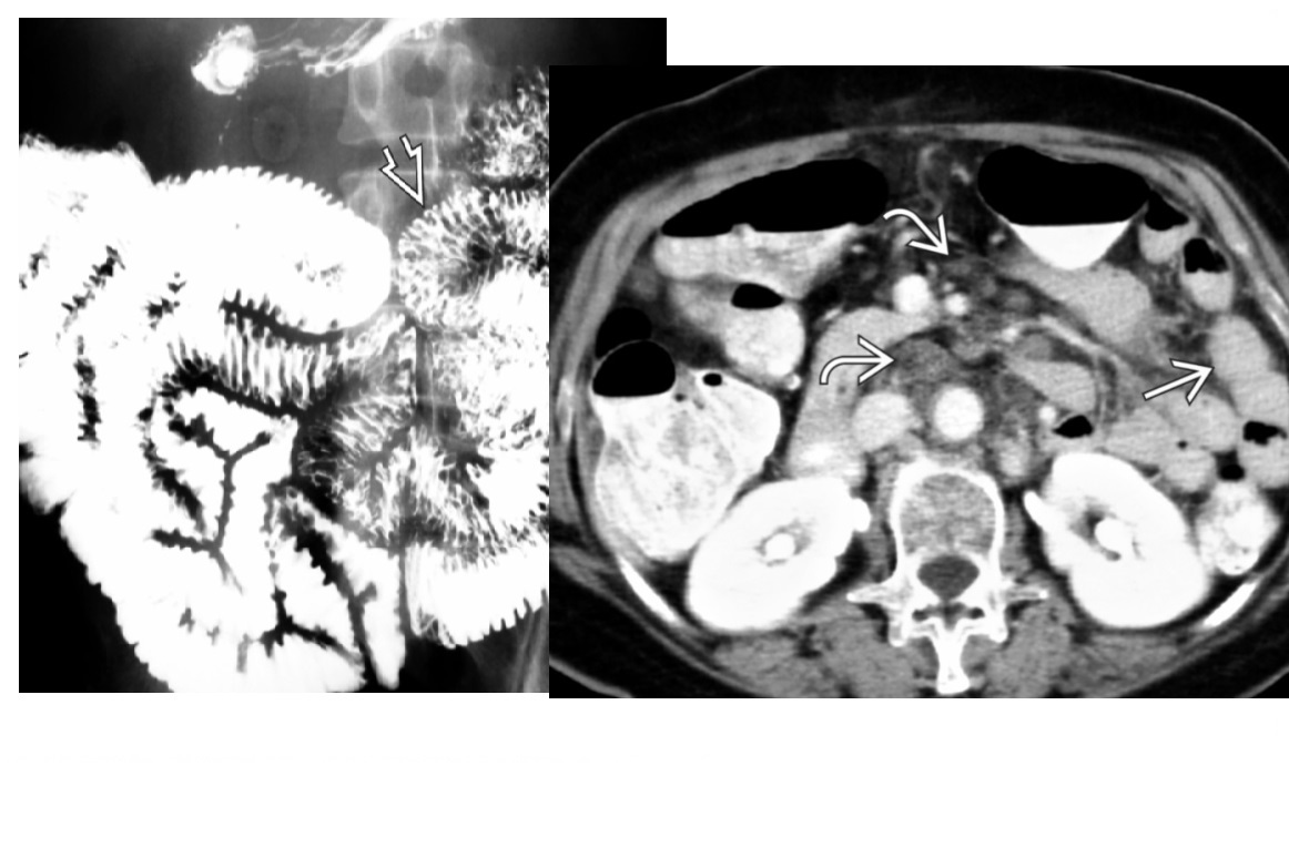 Focal circumferential bowel wall thickening in the proximal small bowel