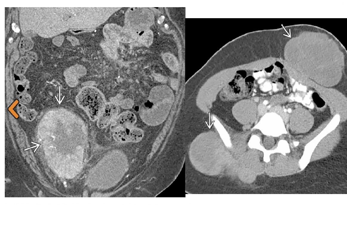 Small bowel mesentery or abdominal wall mass arising at site of scarring from prior surgery