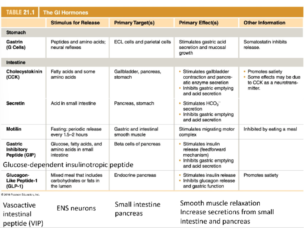 -some act outside the Gi tract (brain). ex: cholecystokinin-satiety, ghrelin-hunger
