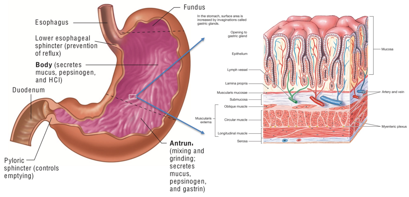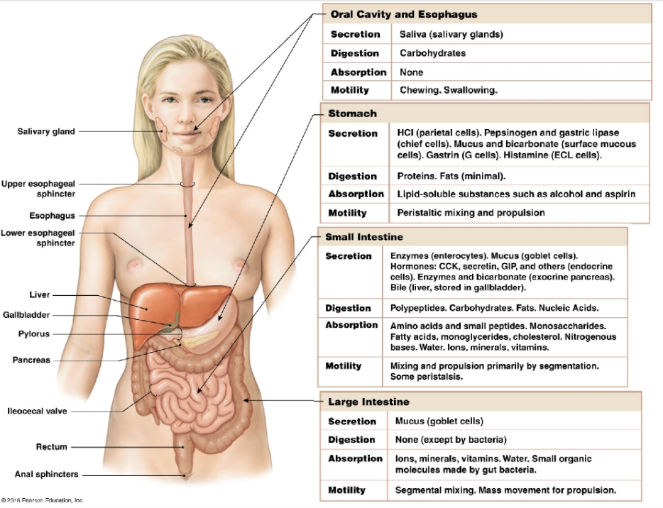 -storage: stores food and regulates its passage into the small intestine