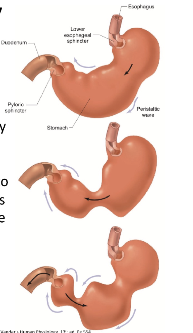 -weak peristaltic waves (15-25 secs) that increase in force proceeding down the antrum moves chyme toward pylorus (propulsion) and then larger particles are moved back to the body (retropulsion)