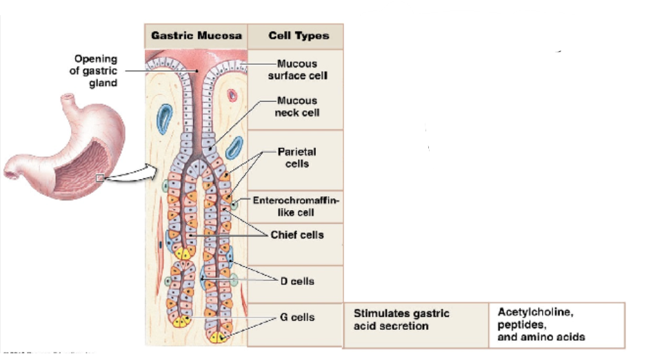 G-cells release gastrin (hormone) in response to amino acids, peptides and distention (short reflex-GRP)