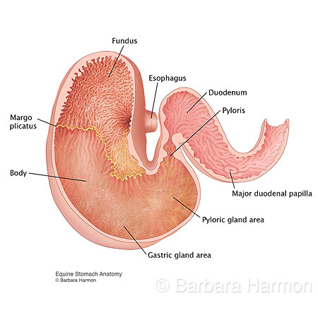 Horse - Margo plicatus (separates regions of the stomach). Fundus in non-glandular as it arises from the oesophageal regions Pigs - Only mucous glands - develops from cardiac regions. Very extensive fundus.