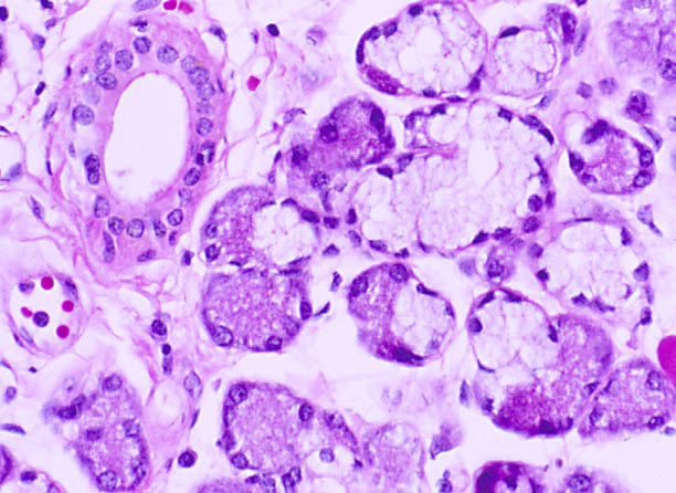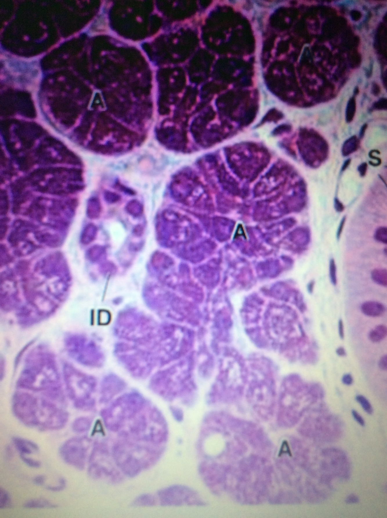 Found in the salivary glands - parotid (all serous) and sub-mandibular glands (mixed but produces 75% of saliva secretion)