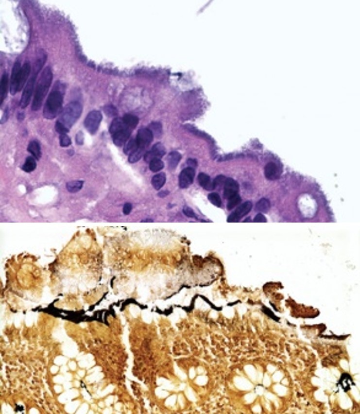 • This infection must be suspected and a “fringed,” basophilic line is seen along the apical border of colonicytes (including colonocytes within crypts). Organisms along the epithelial surface are highlighted by silver stains (Warthin-Starry and Steinter stains). Alcial blue pH 2.5 and PAS stains can also be used, while Gram stains usually fails to highlight these organisms.