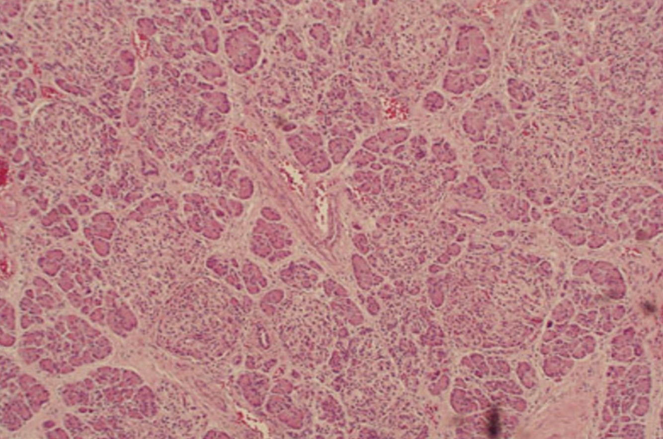 GANGLIOCYTIC PARAGANGLIOMA * benign course * exclusively in duodenum * Histologic triad 1. Zellballen nests 2. Epithelioid ribbons and nests 3. Fibrillary matrix with ganglion-like cells
