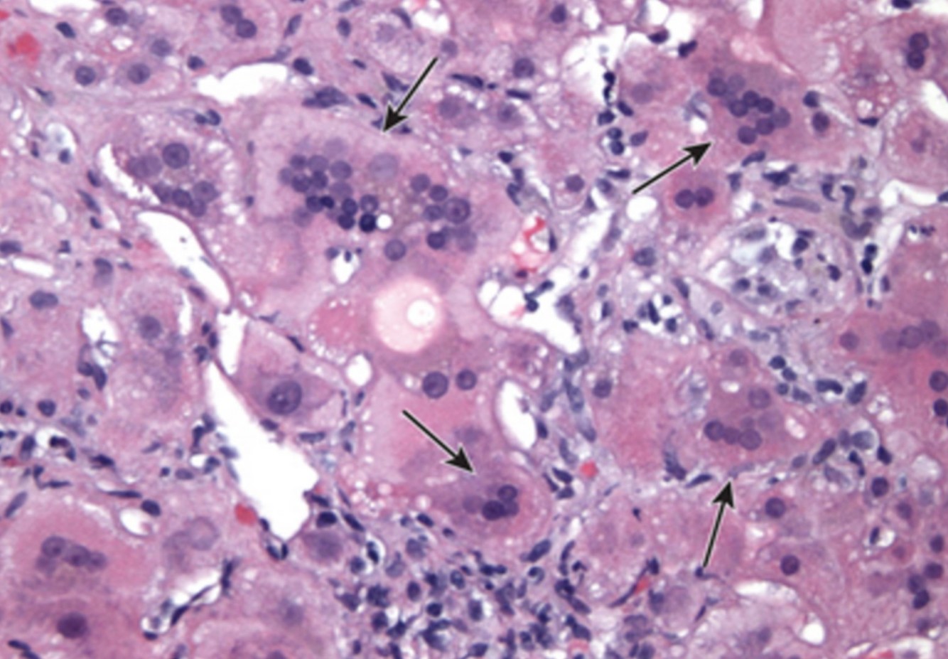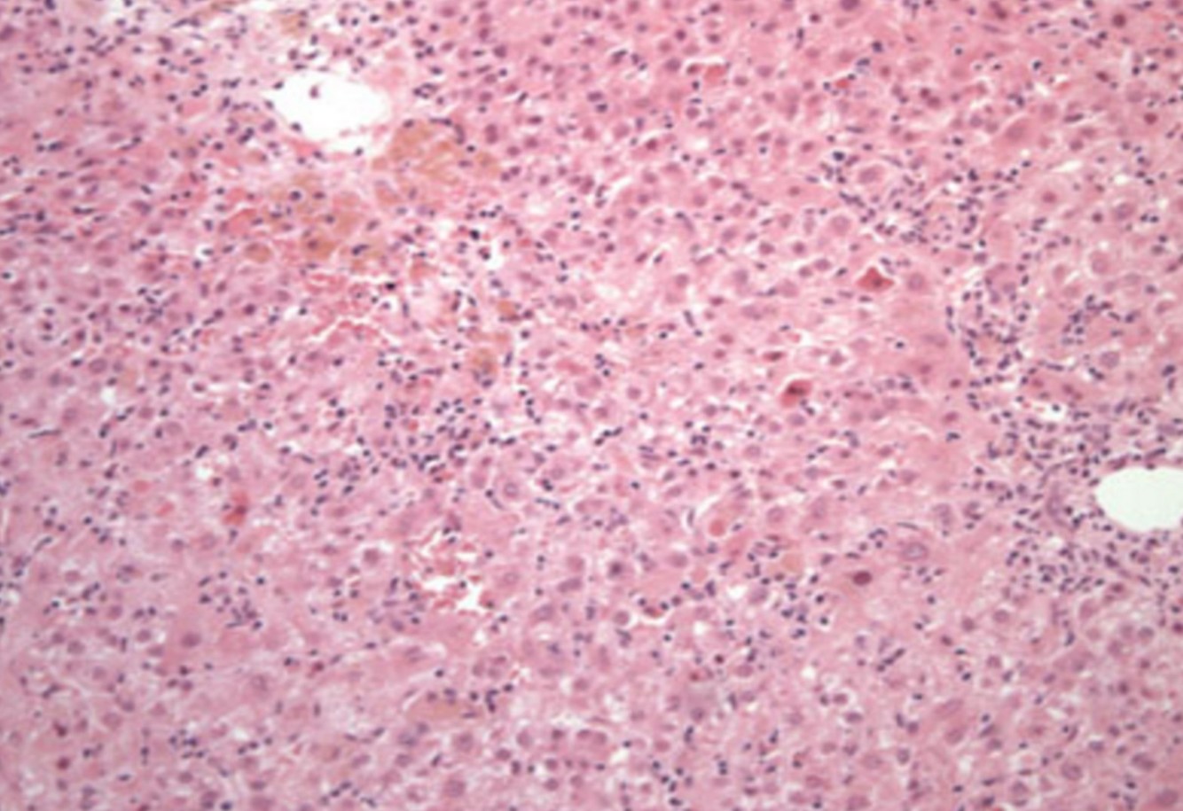 • Histologic determination of the cause is often difficult. Helpful additional features favoring drug-induced liver injury include abundant eosinophils, bile duct damage, granulomas, and otherwise atypical histologic features for acute hepatitis.