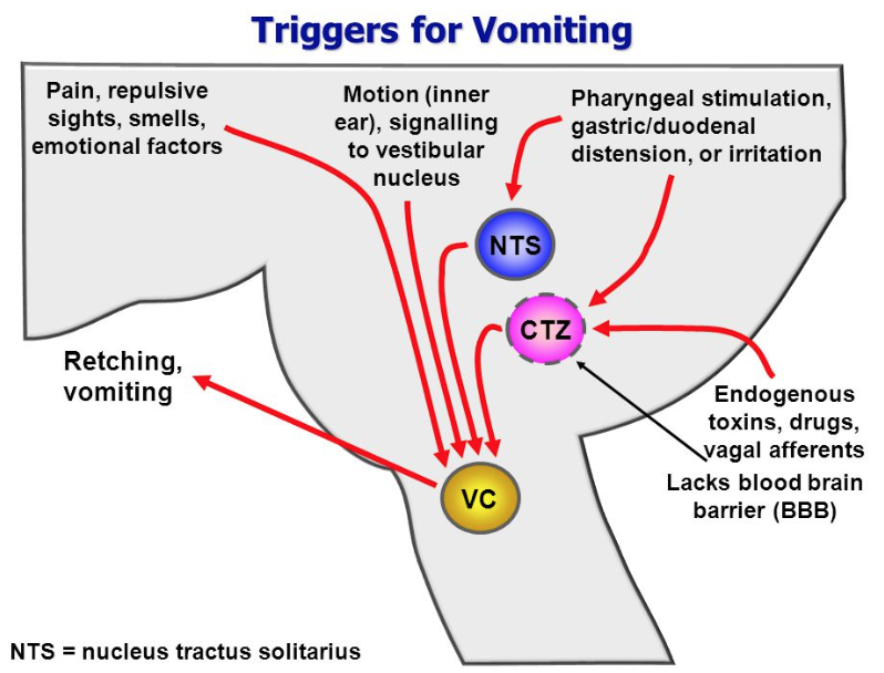 Limited blood brain barrier in the medulla allows the CRTZ to be exposed to blood-borne chemicals (drugs, uremia, etc)