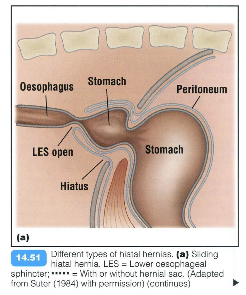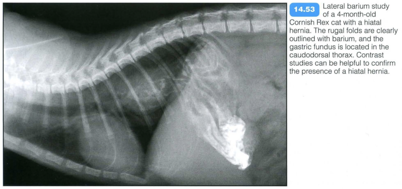 The lower oesophageal sphincter moves freely back and forth into the caudal mediastinum, followed by parts of the stomach, through a loose oesophageal hiatus. Clinical signs include variable degrees of vomiting or regurgitation, hypersalivation and chronic weight loss. If the stomach is incarcerated, severe respiratory distress can be present. Aspiration pneumonia is frequently associated with this