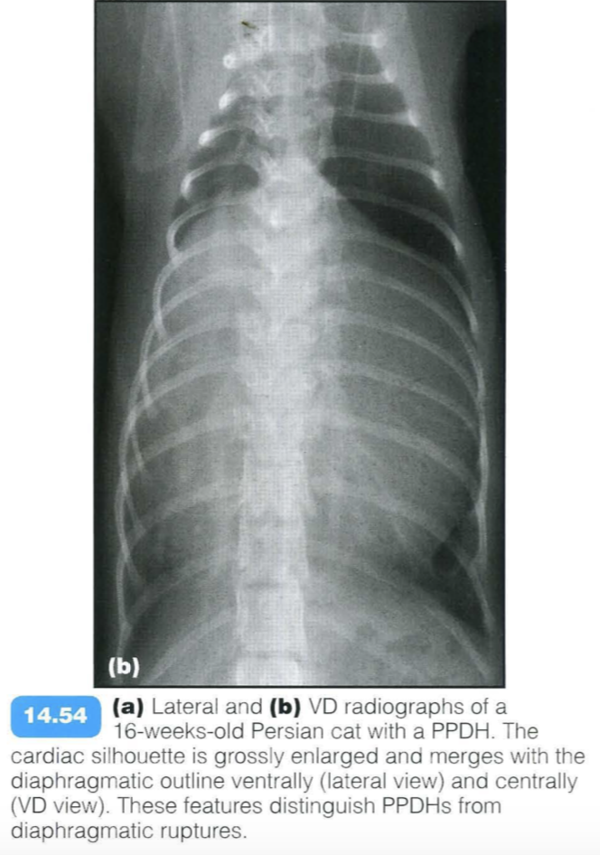 Peritoneopericardial diaphragmatic hernia (PPDH) is the most common diaphragmatic hernia in dogs and cats. It is due to an embryological fusion defect in the ventral diaphragm, leading to a communication between the pericardial and the peritoneal cavities. PPDHs are often associated with sternal or cardiac defects. The liver is the most frequently herniated organ, and may be associated with gallbladder, stomach, small intestine or omental herniation.