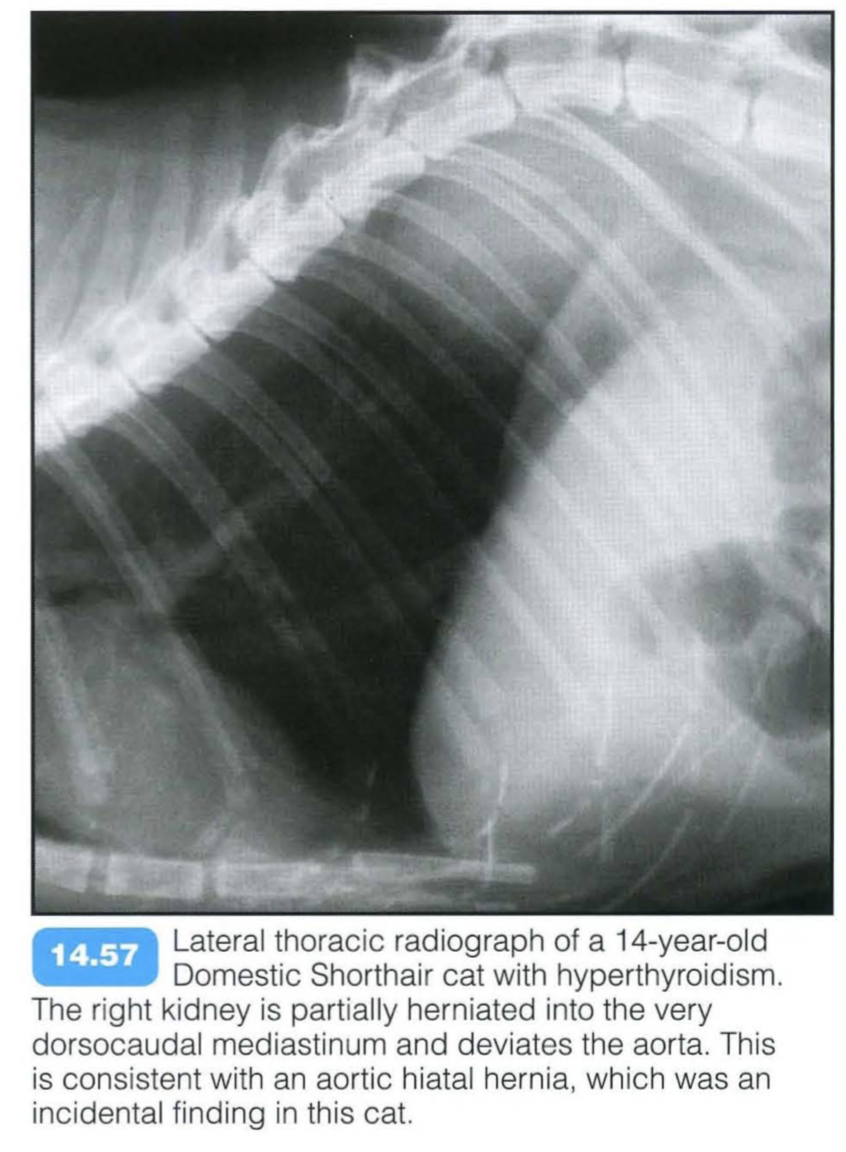 The aortic hilus is the only diaphragmatic opening that connects the mediastinum with the retroperitoneal space. Free mediastinal gas can pass through the hilus and enter the retroperitoneal space relatively easily. If defects in this hilus exist, retroperitoneal organs such as the adrenal glands and kidneys can prolapse into the mediastinum. Intramediastinal kidneys are rare in dogs and cats and are usually detected incidentally.