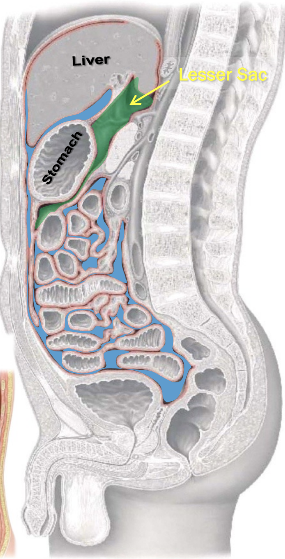* The greater sac includes the vast majority of the peritoneal cavity