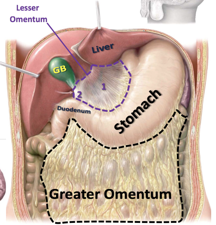 The lesser omentum encompasses two important ligaments, the hepatogastric ligament (1) and hepatoduodenal ligament (2)