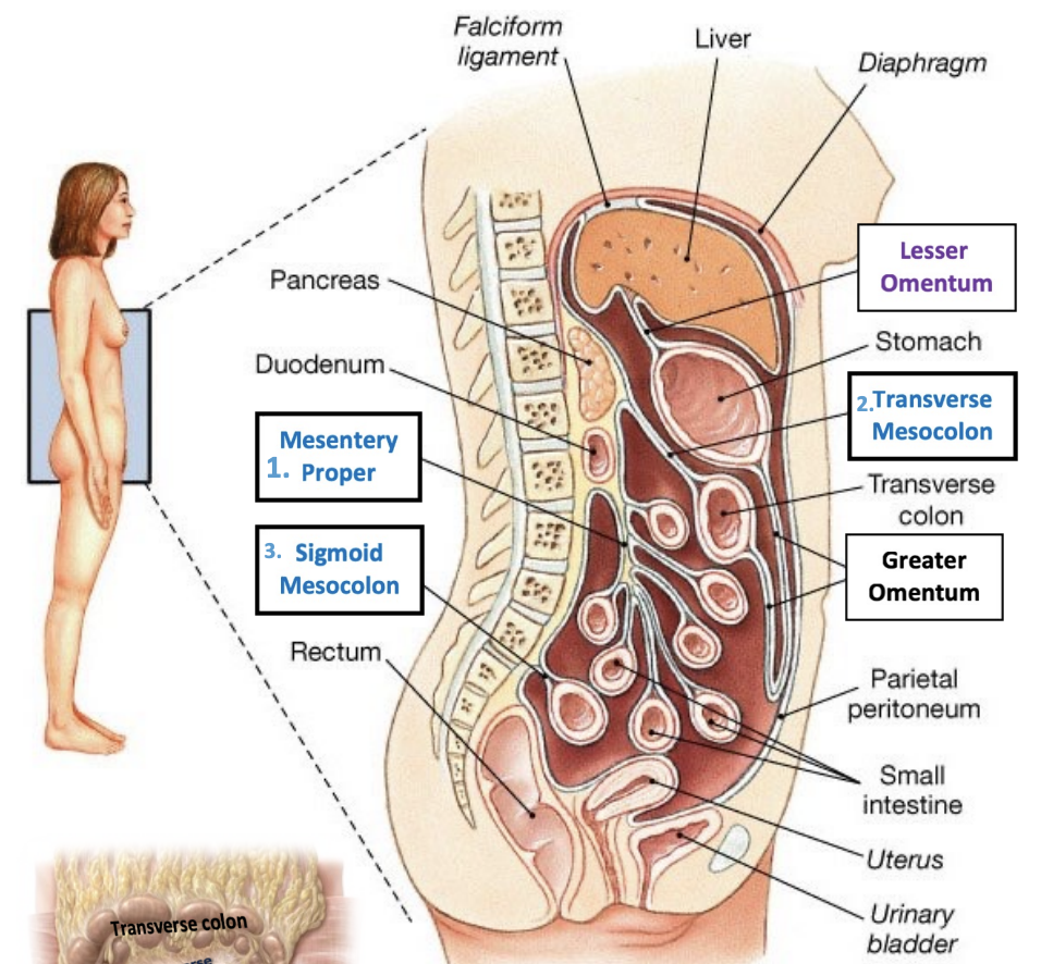 The greater omentum is an apron-like peritoneum that originates from the greater curvature of the stomach/ proximal duodenum and drapes over the small intestines