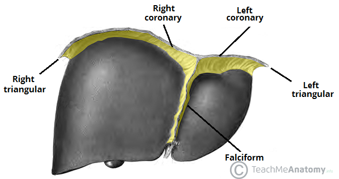 The falciform ligament (attach anterior) The coronary and triangular ligaments (attach superior liver) The IVC