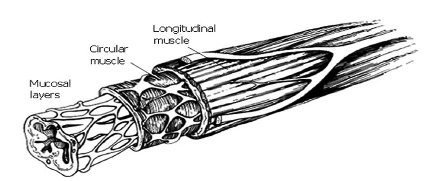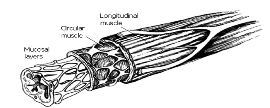 How do the longitudinal and circular muscle layers work together?