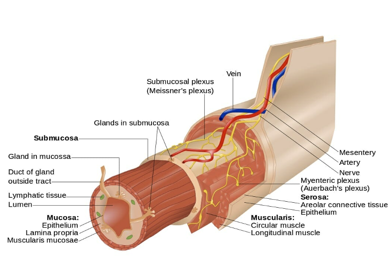 The myenteric plexus is situated between the smooth muscle layers and regulates their function.