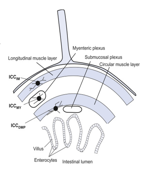 It controls motility through enteric neurons, interstitial cells of Cajal (ICC cells or GI pacemakers), and smooth muscle cells.