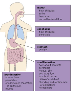 normal flora crowd out pathogens, saliva contains lysozymes “animals licking wounds”