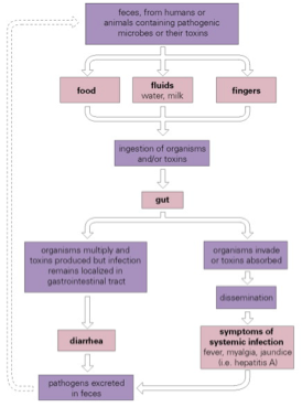 Deep invasion to blood or lymphatics; dissemination to other body sites, dysentery in the large intestine e.g. hepatitis A, enteric fevers