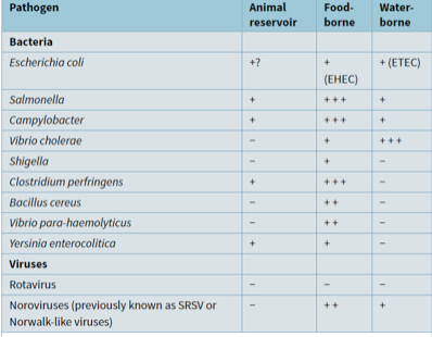 describe these organisms commonly found in the GI and if they were found in the animal reservoir, food-brone, or water borne