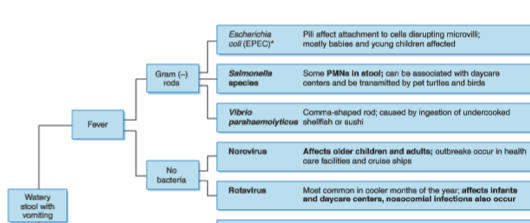 patient has watery stools w/ vomiting w/ fever what are the bugs?