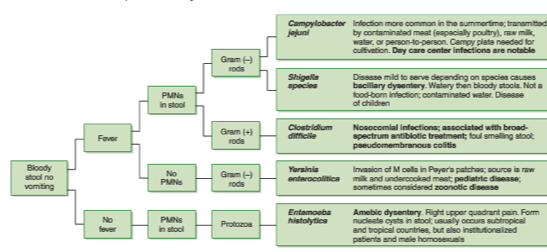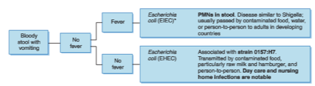bloody stool with vomiting w/ no fever or no fever what are the bugs?