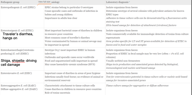Enterohemorrhagic E. coli (EHEC): the infamous O157:H7strain and others, with bloody diarrhea and risk of hemolytic uremic syndrome. These contain Shiga toxins (commonly due to meat recall) with an A:B5 format, where once internalized after one of the five binding units is taken in, the active unit is split and one component acts as an enzyme to then shut down ribosomal function. The appearance of schistocytesin the peripheral smear and inflammation affecting glomeruli and other vessels indicates the presence of endothelial damage and triggering of a microangiopathichemolytic anemia, sticking up from platelet clumps and act to cut up RBCs or shystocytes. triggering fibrin conduction. very impacting in the kidney hemolytic niuremic syndrome. dont treat w/ antibiotics because you dont want the bacteria to burst more. Dialysis may be necessary as part of the supportive treatment.