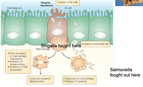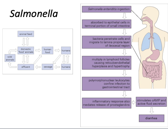 Salmonellaentericaconsists of many serotypeswell, with a major distinction between typhoid and others. General features of interest include: enters via endocytosis taken up by peyers patch if not caught there can circulate around and cause typhoid fever.