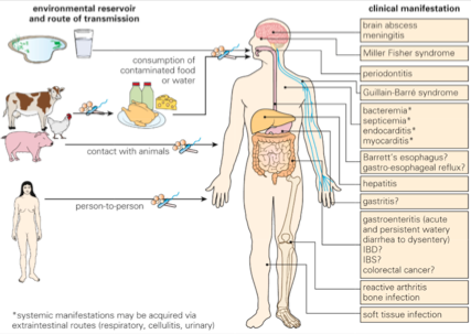 illness can be associated with Guillain-Barrésyndrome, with ganglioside-like components of its LPS triggering autoantibodies against myelin. gram - rod poultry and beef reservoir