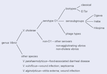 Vibrio parahaemolyticusalso causes a watery diarrhea. Therecan be fever and some bloodiness to it, as V.parahaemolyticuscan be invasive, as compared to cholera.