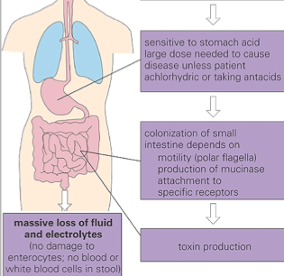 Virulence factors: adhesion to intestinal epithelium, flagella for motility for spreading; cholera- toxin driven