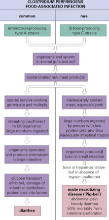 Clostridium perfringens: consumption of the spores in meat can lead to a fairly common diarrhea (as vs. a gas gangrene).
