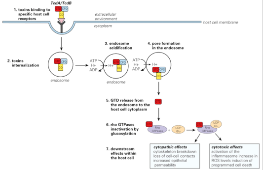 Virulence factors:endospore formation, toxin A as enterotoxin, toxin B as cytotoxin