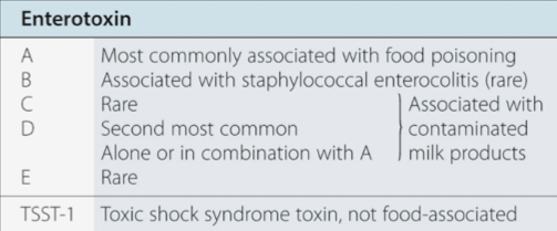 Staphylococcus aureusgenerates a number of exotoxins. The one that you might be most familiar with is enterotoxin A that triggers vomiting (rarely diarrhea) within 3-6 hours of consumption of contaminated food that is usually protein-rich. Wash those hands prior to food preparation!